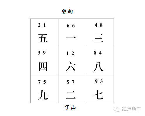 根据北半球的罗盘,歌剧院属于坐丁向癸,那么六运的坐丁向癸飞星图如下: