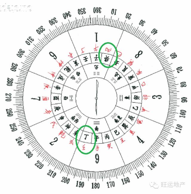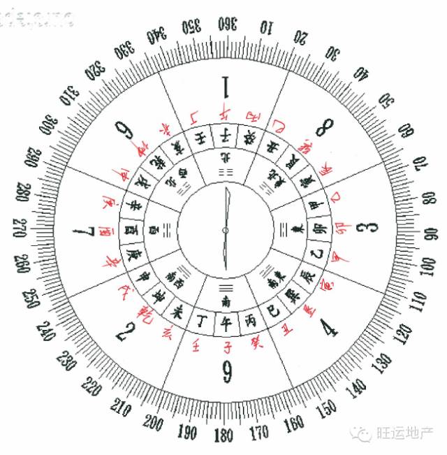 上面是八卦宫位的变化,但是对于罗盘,毕竟要复杂得多。下面这图是我自己所画的南半球的罗盘图。里面一层黑色的是北半球的 24 山罗盘图,外面那层红色的就是改正过来的南半球的 24 山罗盘图。