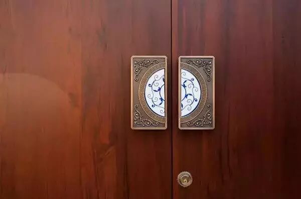 家的门是这样的。 门庭所用将军门。据说是进口东南亚柚木外包铜边。把手很有特色,内嵌青花瓷板。看上去很精致。