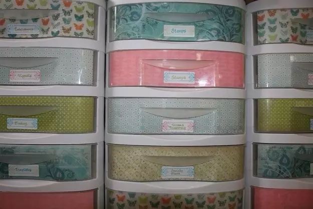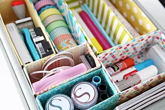 塑料储物盒和抽屉里面衬上好看的包装纸,分类so easy!