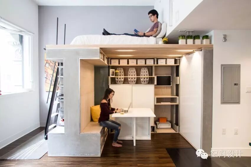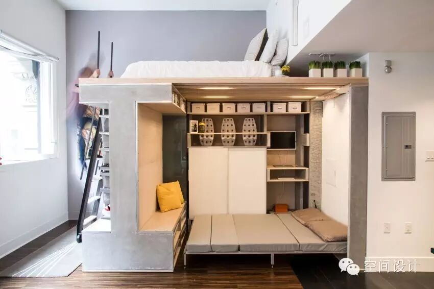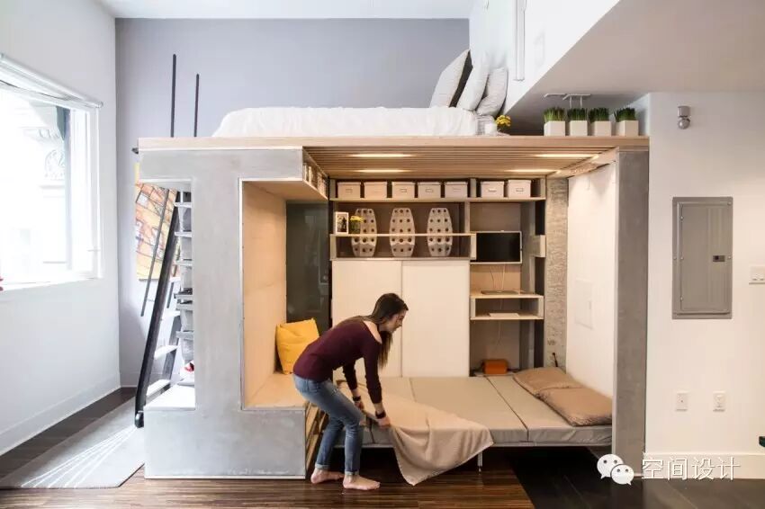 卧房、客餐厅都浓缩在20平米的使用面积内,设计师打造了上下结构,上面安排了主卧床。床下设计了工作空间,可收纳折叠的餐桌。一面墙设计成椅子,一面墙则是收纳客床,需要时,可以打开供使用。