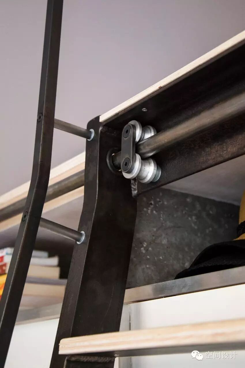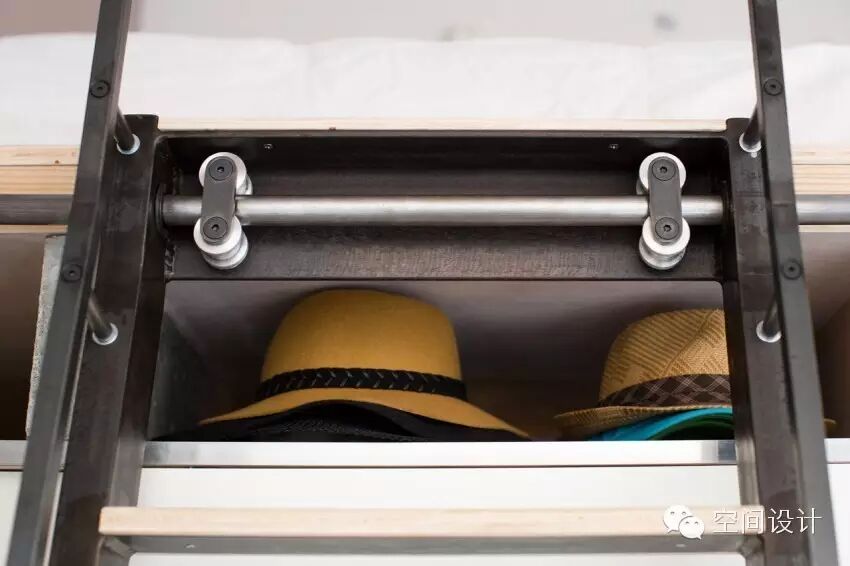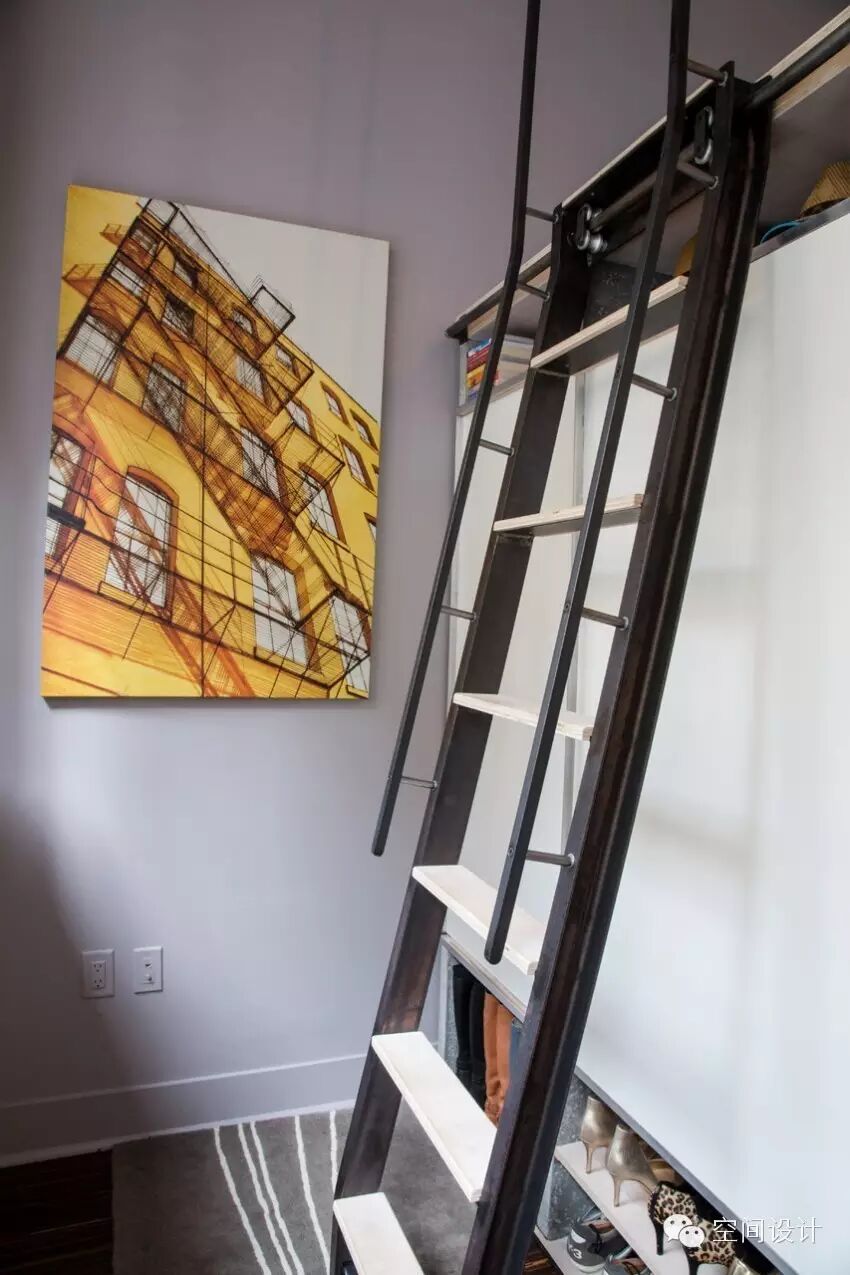 靠窗的一面壁橱设计了楼梯和衣柜,鞋柜,供于收纳使用。