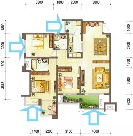 动线良好(从入户门进客厅、卧室、厨房的三条条线不会交叉)
