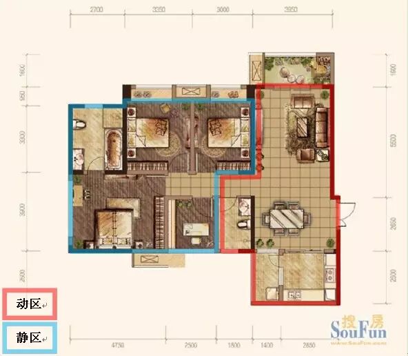 动区是人们活动较为频繁的区域,应该靠近入户门设置,尤其是厨房;而静区主要供居住者休息,相对比较安静,应当尽量布置在户型内侧。两者分离,一方面使会客、娱乐或者进行家务的人能够放心活动,另一方面也不会过多打扰休息、学习的人,减少相互之间的干扰。详见以下范例: