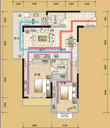 动线是指人们在户内活动的路线,动线流畅与否将影响人们进行各种活动时能否实现顺利转换。户型的设计影响到动线的走向,而动线的走向会影响到居住的品质。好的动线能够提升小户型利用率,而差的动线会使大户型变得“大而无当”,浪费空间。户内主要动线有三类,分别是居住动线、家务动线、来客动线。