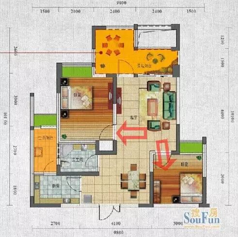动静分区不合理户型(次卧距离入户门较近,客厅活动对次卧影响较大)
