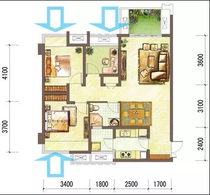 通透性主要是指户型的通风和采光性能。要保证户型具有良好的通透性能,首先要求户型要有良好的进深开间比,即户型比较方正;其次户型最好有两面可以采光和通风,相对两面采光通风最佳(如南北、东西),其次是相邻两面采光(如东和南、南和西、西和北等),只有一面采光通风效果最差。另外厨房厕所是湿气比较重的两个区域,要尽量做到独立采光通风,也就是避免暗厨暗卫。